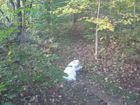 Later I walk mountain as dusk draws down light on yellow leaves illuminating mud. Rokie's white coat flashes to and fro.
