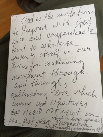 God is the invitation to respond with good will and compassionate heart to whatever presents itself in our lives for continuing movement through and through, cultivating love which burns up whatever need not exist in the first place which is ever-present origination continually manifesting Itself.